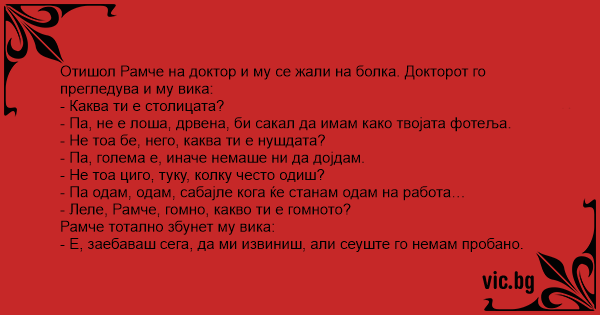 Отишол Рамче на доктор и му се жали на болка. Докторот го прегледува и му вика: