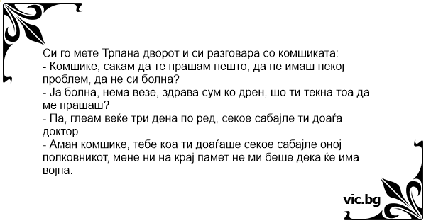 - Аман комшике, тебе коа ти доаѓаше секое сабајле оној полковникот, мене ни на крај памет не ми беше дека ќе има војна.