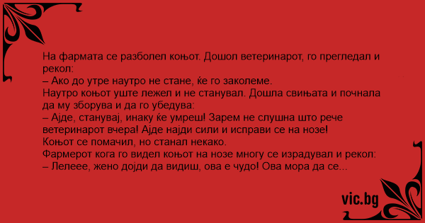 На фармата се разболел коњот. Дошол ветеринарот, го прегледал и рекол:
