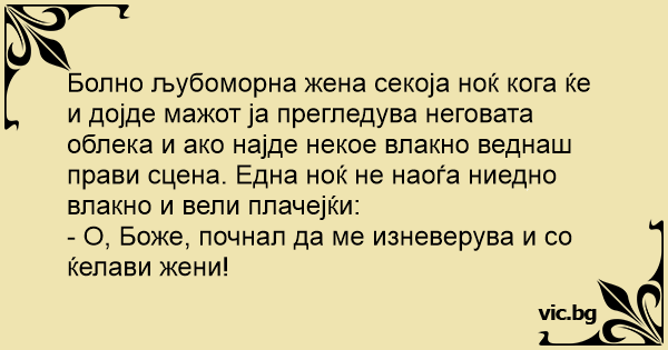 Болно љубоморна жена секоја ноќ кога ќе и дојде мажот ја прегледува неговата облека и ако најде некое влакно веднаш прави сцена. Една ноќ не наоѓа ниедно влакно и вели плачејќи: