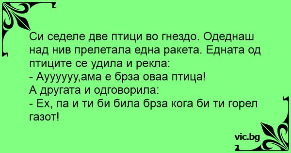Си седеле две птици во гнездо. Одеднаш над нив прелетала една ракета. Едната од птиците се удила и рекла: