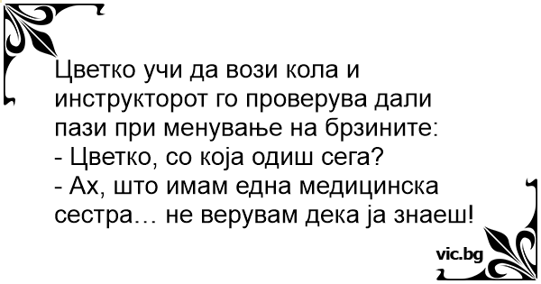 Цветко учи да вози кола и инструкторот го проверува дали пази при менување на брзините: