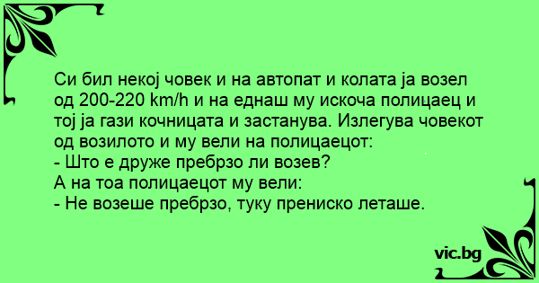 Си бил некој човек и на автопат и колата ја возел од 200-220 km/h и на еднаш му искоча полицаец и тој ја гази кочницата и застанува. Излегува човекот од возилото и му вели на полицаецот: