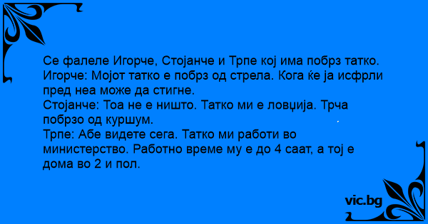 Трпе: Абе видете сега. Татко ми работи во министерство. Работно време му е до 4 саат, а тој е дома во 2 и пол.