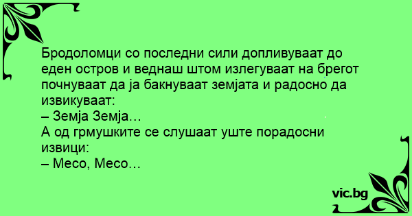Земя, земя! Корабокрущенец с последни сили се добира до близкия остров и още с идването си започва да целува земята и да крещи от радост: