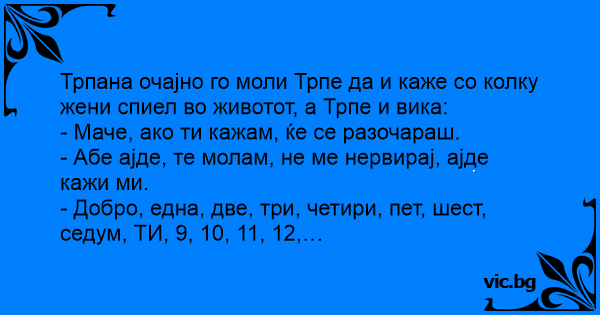 Трпана очајно го моли Трпе да и каже со колку жени спиел во животот, а Трпе и вика: - Маче, ако ти кажам, ќе се разочараш. - Абе ајде, те молам, не ме нервирај, ајде кажи ми. - Добро, една, две, три, четири, пет, шест, седум, ТИ, 9, 10, 11, 12,…