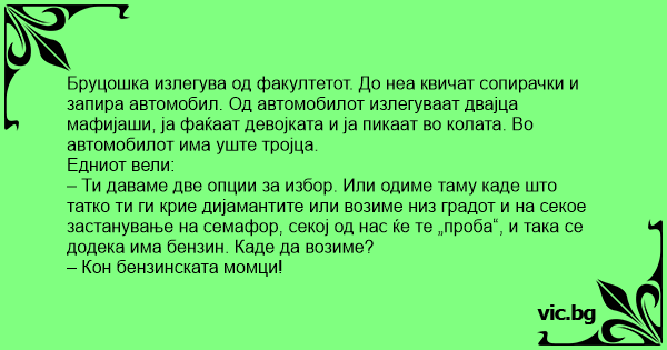 – Ти даваме две опции за избор. Или одиме таму каде што татко ти ги крие дијамантите или возиме низ градот и на секое застанување на семафор, секој од нас ќе те „проба“, и така се додека има бензин. Каде да возиме?