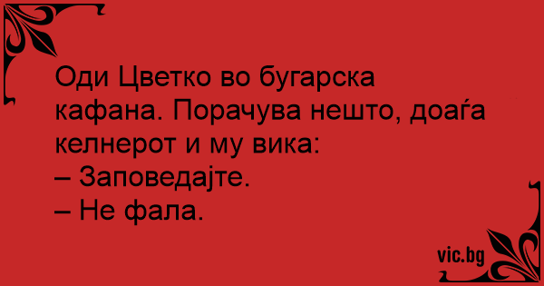 Оди Цветко во бугарска кафана. Порачува нешто, доаѓа келнерот и му вика: