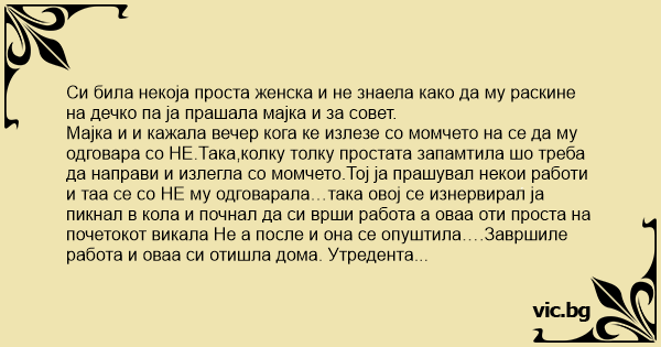 Мајка и и кажала вечер кога ке излезе со момчето на се да му одговара со НЕ.Така,колку толку простата запамтила шо треба да направи и излегла со момчето.Тој ја прашувал некои работи и таа се со НЕ му одговарала…така овој се изнервирал ја пикнал в кола и почнал да си врши работа а оваа оти проста на почетокот викала Не а после и она се опуштила….Завршиле работа и оваа си отишла дома. Утредента мајка и ја прашала шо бидело и оваа си кажала дека на крај ја плеснале.Мајка и се изнерврала и ја прашала:
