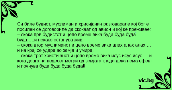 – скока трет христијанот и цело време вика исус исус исус…. и кога доаѓа на педесет метри од земјата гледа дека нема ефект и почнува буда буда буда буда!!!