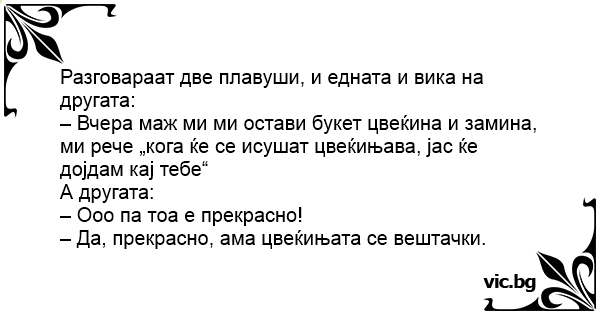 – Вчера маж ми ми остави букет цвеќина и замина, ми рече „кога ќе се исушат цвеќињава, јас ќе дојдам кај тебе“
