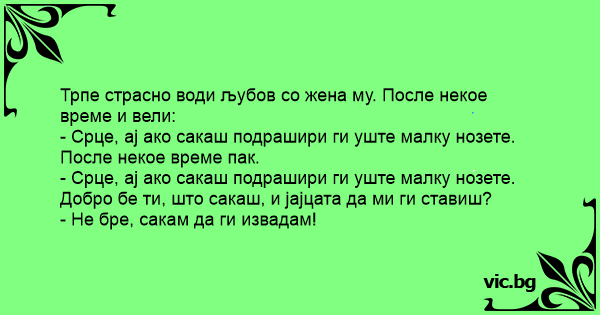 Трпе страсно води љубов со жена му. После некое време и вели: