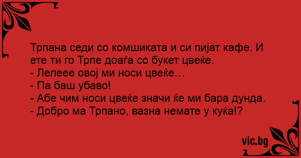 Трпана седи со комшиката и си пиjат кафе. И ете ти го Трпе доаѓа со букет цвеќе.