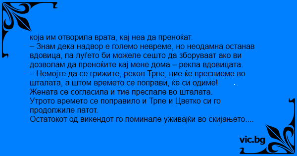 – Немојте да се грижите, рекол Трпе, ние ќе преспиеме во шталата, а штом времето се поправи, ќе си одиме!