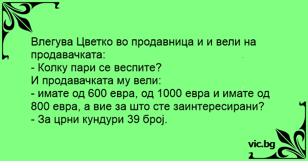 Влегува Цветко во продавница и и вели на продавачката: