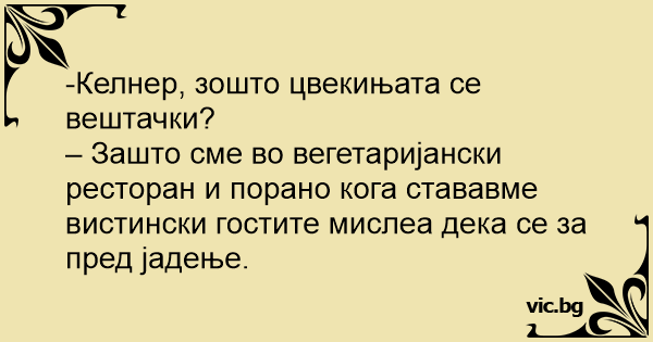 – Зашто сме во вегетаријански ресторан и порано кога стававме вистински гостите мислеа дека се за пред јадење.