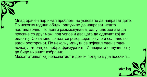 По неколку години обиди, одлучиле да направат нешто нестандардно. По долги размислувања, одлучиле жената да преспие со друг маж, под услов и двајцата да одлучат кој да биде тој. Се качиле во воз, си резервирале купе и седнале во вагон ресторанот. По неколку минути се појавил еден згоден дечко, дотеран, со добра фризура итн. И двајцата одлучиле тој да биде нивниот избраник.