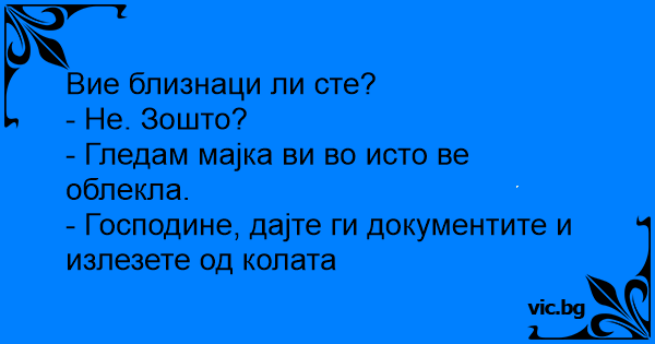- Добар ден... - Добар ден, извинете, дали сте близнаци? - Не, зошто прашувате? - Па, мајка ви исто ве облекла, баш сте слатки! - Господине, ве молам излезете од автомобилиот и донесете ја возачката и сообраќајната дозвола!