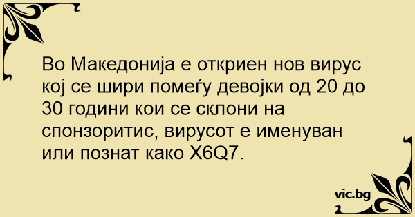 Во Македонија е откриен нов вирус кој се шири помеѓу девојки од 20 до 30 години кои се склони на спонзоритис, вирусот е именуван или познат како X6Q7.