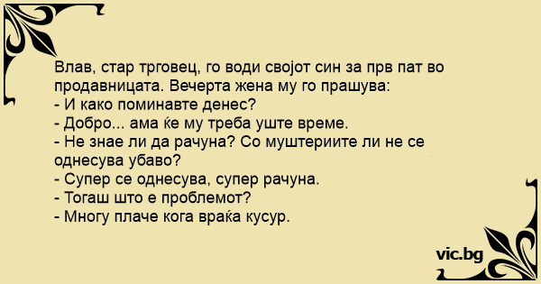 Влав, стар трговец, го води својот син за прв пат во продавницата. Вечерта жена му го прашува: