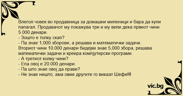 Влиза клиент в зоомагазин и пита продавача, защо папагалите са с различна цена. Продавачът му обяснява: