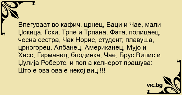 Влегуваат во кафич, црнец, Баци и Чае, мали Џокица, Гоки, Трпе и Трпана, Фата, полицаец, чесна сестра, Чак Норис, студент, плавуша, црногорец, Албанец, Американец, Мујо и Хасо, Германец, блодинка, Чае, Брус Вилис и Џулија Робертс, и поп а келнерот прашува: