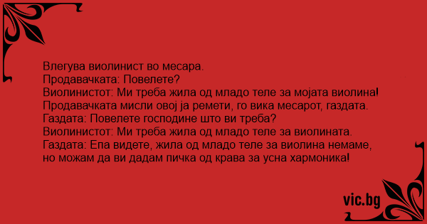 Газдата: Епа видете, жила од младо теле за виолина немаме, но можам да ви дадам пичka од крава за усна хармоника!