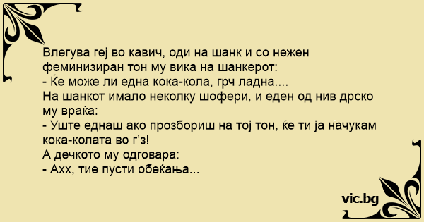 Влегува геј во кавич, оди на шанк и со нежен феминизиран тон му вика на шанкерот: