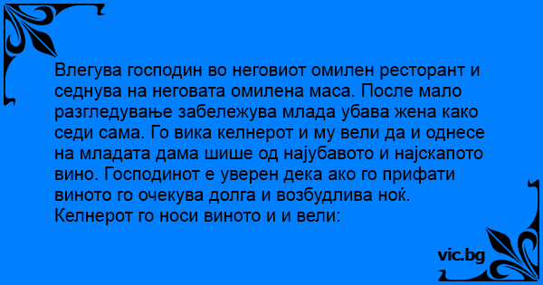 Влегува господин во неговиот омилен ресторант и седнува на неговата омилена маса. После мало разгледување забележува млада убава жена како седи сама. Го вика келнерот и му вели да и однесе на младата дама шише од најубавото и најскапото вино. Господинот е уверен дека ако го прифати виното го очекува долга и возбудлива ноќ. Келнерот го носи виното и и вели: