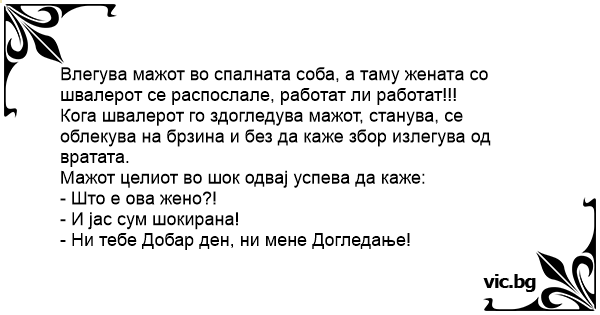 Влегува мажот во спалната соба, а таму жената со швалерот се распослале, работат ли работат!!!