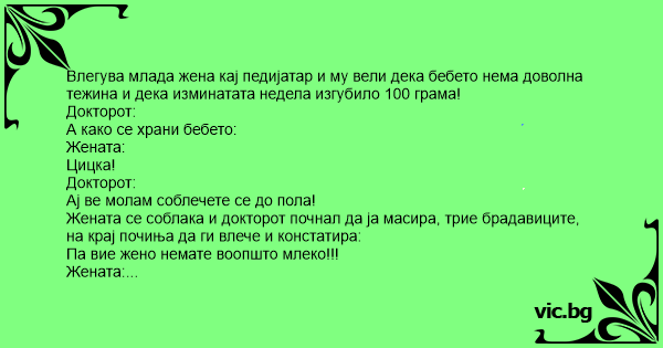 Влегува млада жена кај педијатар и му вели дека бебето нема доволна тежина и дека изминатата недела изгубило 100 грама!