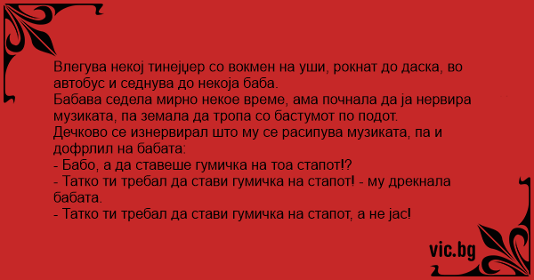 Влегува некој тинејџер со вокмен на уши, рокнат до даска, во автобус и седнува до некоја баба.