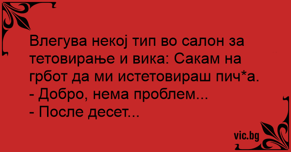 Влегува некој тип во салон за тетовирање и вика: Сакам на грбот да ми истетовираш пич*а.