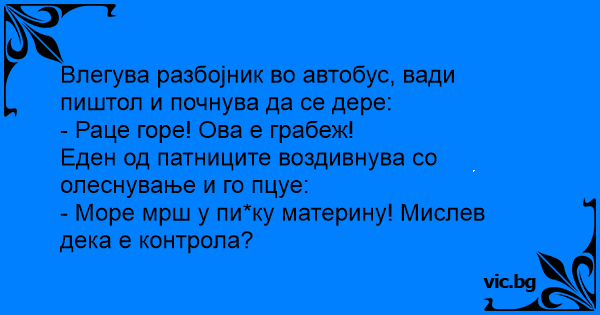 Una donna sospetta entra in una corriera, poco dopo essersi seduta entra un uomo urlando: "Questa è una rapina!!!" E la donna dice: "Che culo... Pensavo fosse il controllore".