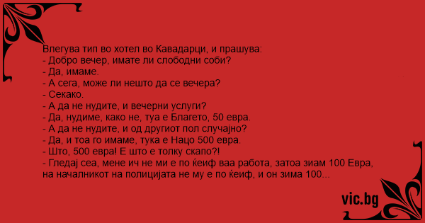 - Гледај сеа, мене ич не ми е по ќеиф ваа работа, затоа зиам 100 Евра, на началникот на полицијата не му е по ќеиф, и он зима 100 Евра, на градоначалникот не му е по ќеиф, и он 100 Евра.