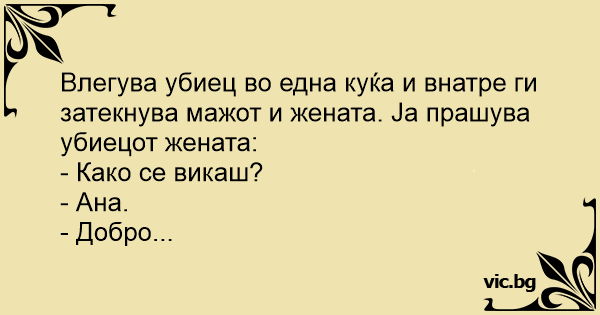 Влегува убиец во една куќа и внатре ги затекнува мажот и жената. Ја прашува убиецот жената: