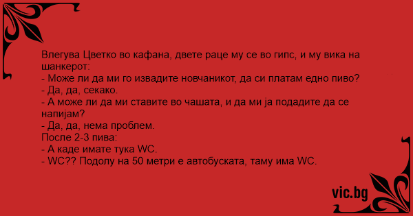 Влегува Цветко во кафана, двете раце му се во гипс, и му вика на шанкерот: