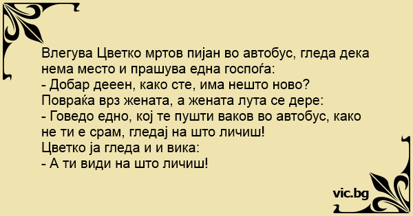 Влегува Цветко мртов пијан во автобус, гледа дека нема место и прашува една госпоѓа: