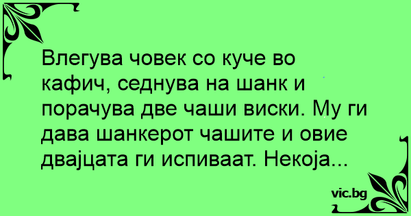 Влегува човек со куче во кафич, седнува на шанк и порачува две чаши виски. Му ги дава шанкерот чашите и овие двајцата ги испиваат. Некоја...