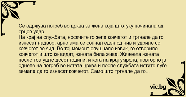 На крај на службата, носачите го зеле ковчегот и тргнале да го изнесат надвор, арно ама се сопнал еден од нив и удриле со ковчегот во sид. Во тој момент слушнале извик, го отвориле ковчегот и што ќе видат, жената била жива. Живеела жената после тоа уште десет години, и кога на крај умрела, повторно ја однеле на погреб во истата црква и после службата истите луѓе земале да го изнесат ковчегот. Само што тргнале да го изнесат ковчеготмажот и викнал: