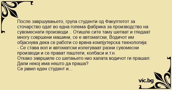 После завршувањето, група студенти од Факултетот за сточарство одат во една голема фабрика за производство на сувомеснати производи .. Отишле сите таму шетаат и гледаат многу совршени машини, се е автоматски, Водичот им објаснува дека се работи со врвна компјутерска технологија: