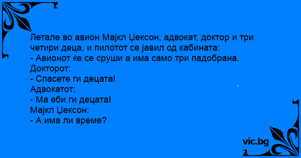 Лети Майкъл Джексън с частния си самолет и група дечица из небето. По едно време пилота го извикал и му казва: - Самолета се повреди, пък имаме само два парашута. Вземай единия и скачай. - Ами...