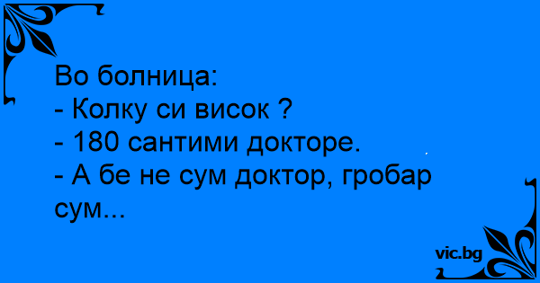 Do szpitalnej sali włazi facet: - Kto miał badania robione dwudziestego? - Jo - jeden z pacjentów podnosi rękę. - Ile Pan ma wzrostu? - Metr sześćdziesiąt, tak jak ten Bercik z telewizora. - Aha -...