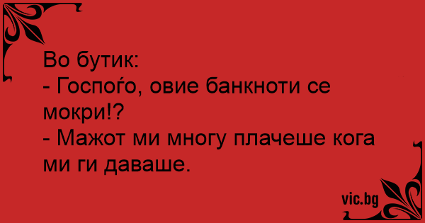 - Извинете, че парите са мокри - казва клиентка в магазина за кожени палта - но мъжът ми така плака като ми даваше парите.