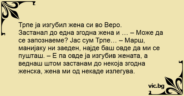 Застанал до една згодна жена и … – Може да се запознаеме? Јас сум Трпе… – Марш, манијаку ни заеден, најде баш овде да ми се пушташ. – Е па овде ја изгубив жената, а веднаш штом застанам до некоја згодна женска, жена ми од некаде излегува.