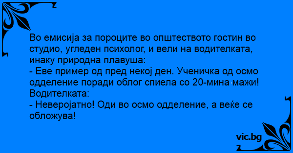 Во емисија за пороците во општеството гостин во студио, угледен психолог, и вели на водителката, инаку природна плавуша: