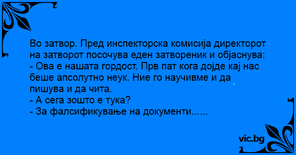 Во затвор. Пред инспекторска комисија директорот на затворот посочува еден затвореник и објаснува: