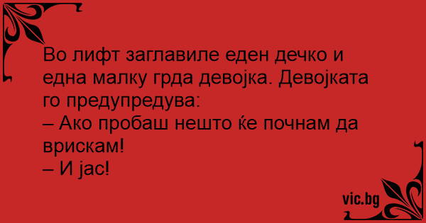 Во лифт заглавиле еден дечко и една малку грда девојка. Девојката го предупредува: