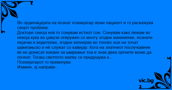 Докторе секоја ноќ го сонувам истиот сон. Сонувам како лежам во некоја куќа во џакузи опкружен со многу згодни манекенки, познати пејачки и водителки, згодни келнерки во топлес кои ни точат шампањско и нè служат со кавијар. Кога на златниот послужавник ќе ни донесат кокаин за шмркање тоа е знак дека оргиите може да почнат. Тогаш светлото малку се придушува и...