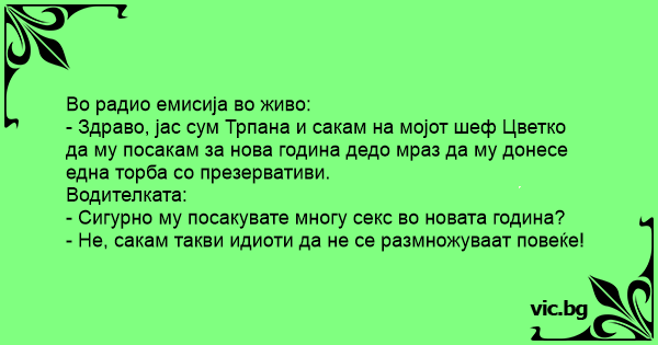 - Здраво, јас сум Трпана и сакам на мојот шеф Цветко да му посакам за нова година дедо мраз да му донесе една торба со презервативи.